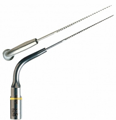 Финишная для широких каналов. Ультразвуковые файлы используются для орошения канала водой или Salvizol во время предоперационной сессии с гипохлоритом натрия для обеззараживания и финальной чистки. В ортоградном лечении эти насадки используются как “игла”. В ретроградном лечении, благодаря своей гибкости они позволяют бережно очищать изгибы каналов, без риска повреждения стенок.